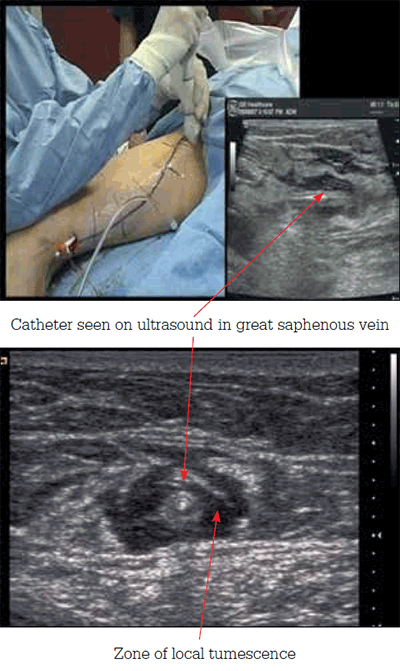 Laser and radiofrequency methods use similar techniques (Figures 1 and 2). Under sedation, and ultrasound guidance, large volume saline and local anaesthetic tumescence is created around the laser or RFA catheter, which is in the lumen of the GSV. A heat source (either laser at various wavelengths or radiofrequency) is then delivered through the catheter to the vein wall, with resultant coagulative necrosis. The saline tumescence creates a heat sink and protects the surrounding tissues from thermal damage.