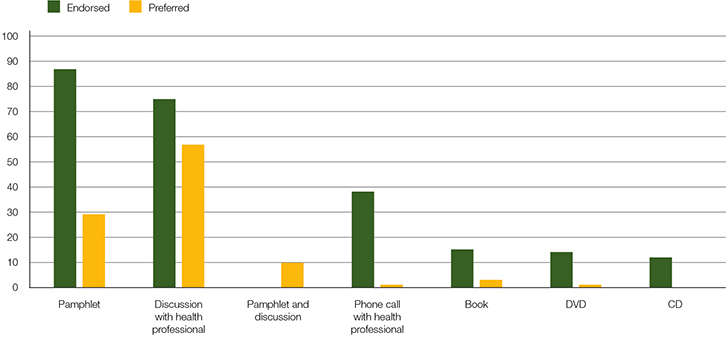 Figure 2. Endorsed and most preferred format for information about what to expect emotionally Note, ‘pamphlet and discussion combined’ was not listed in the original list of options to be ‘endorsed’, hence data only available for ‘preferred’ |